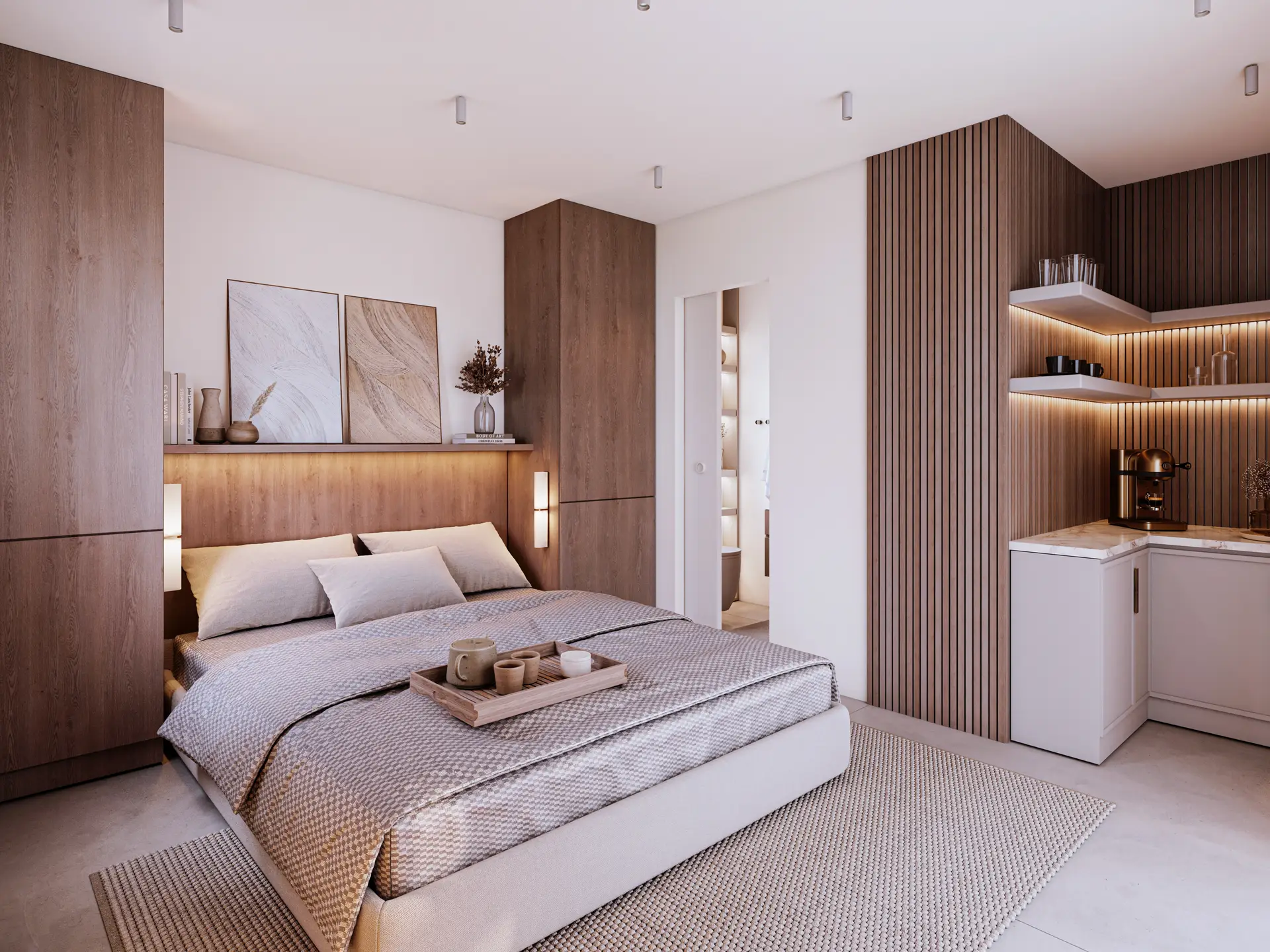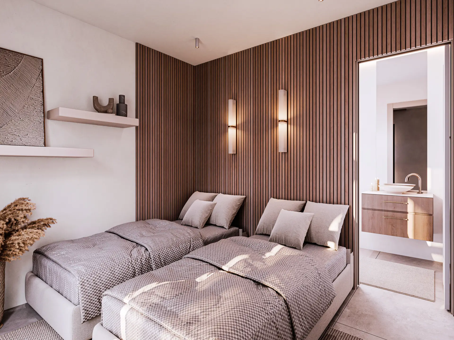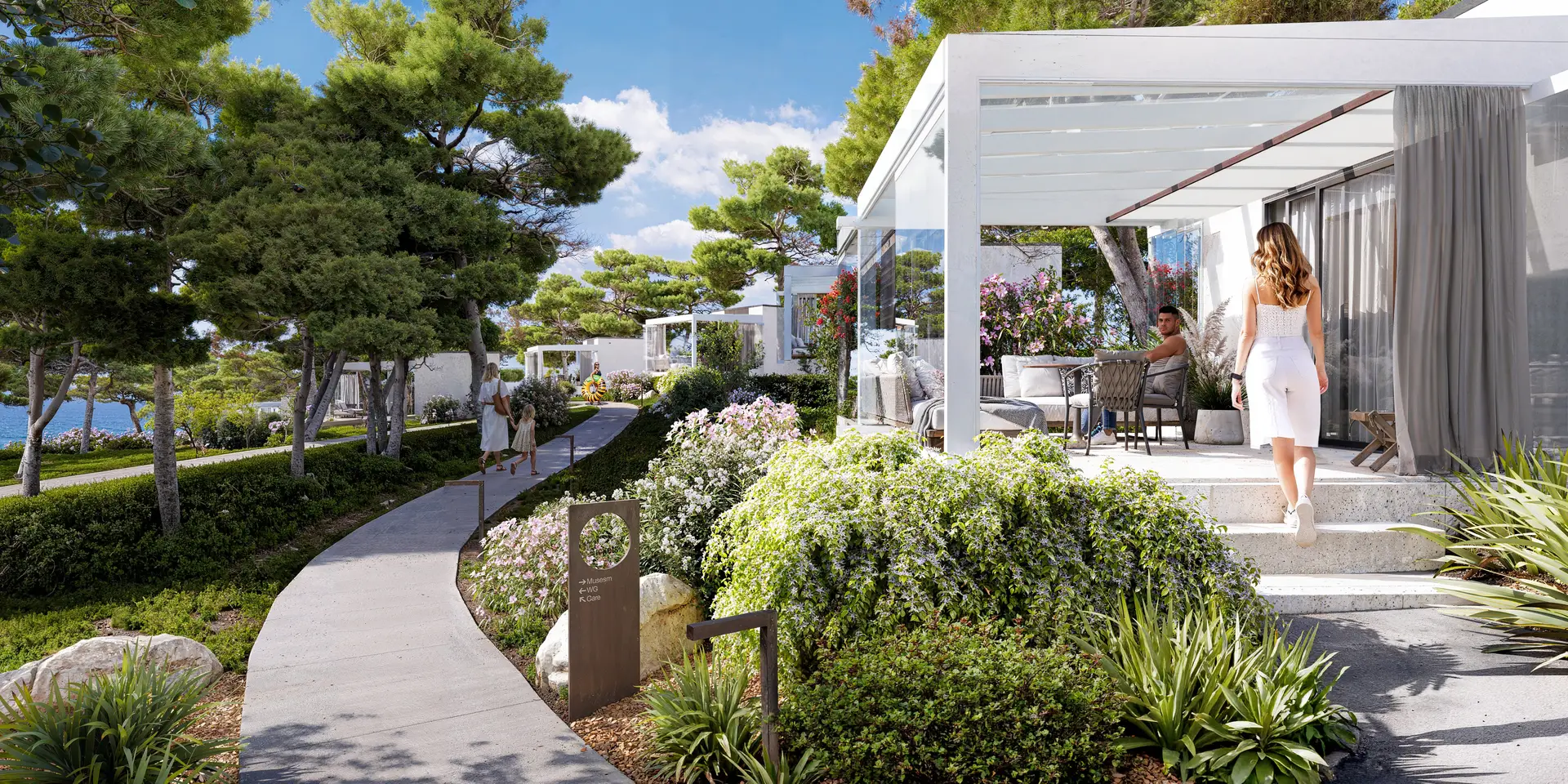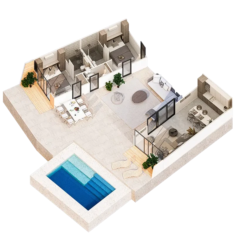 Budynki 1-4: 52 apartamenty o powierzchni 34 m², w tym 13 z prywatnymi ogródkami i 13 z bezpośrednim dostępem do prywatnych basenów.