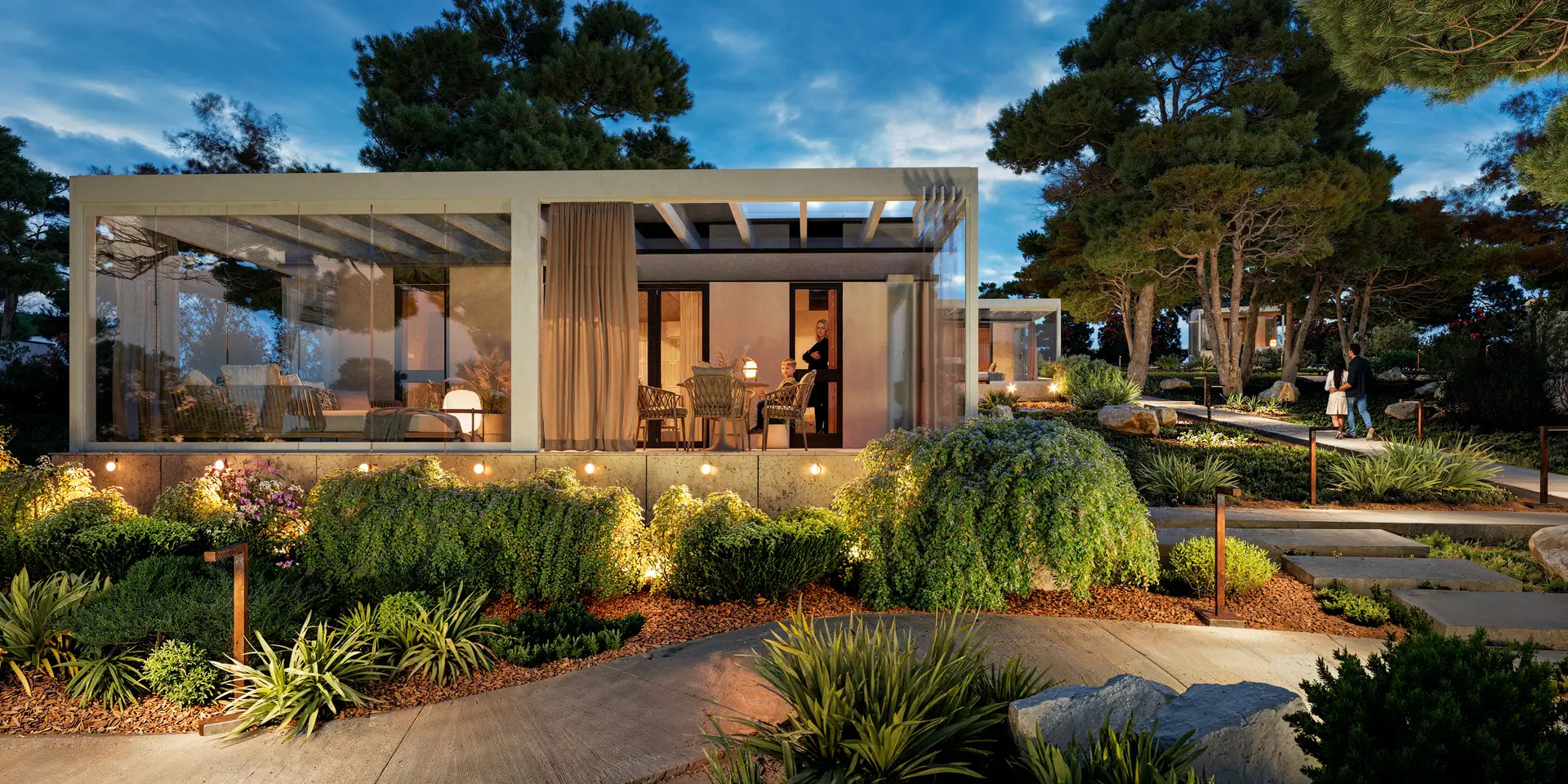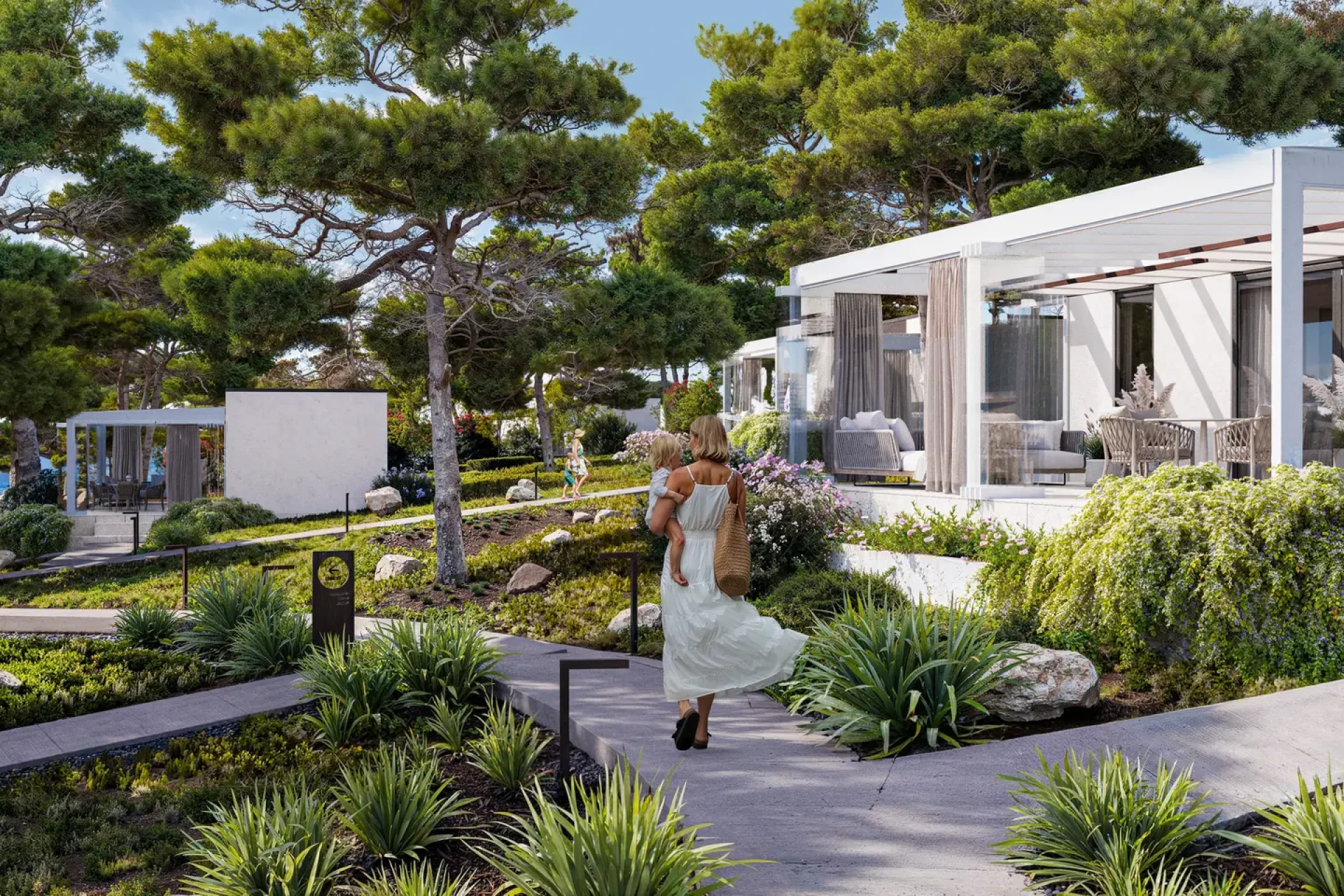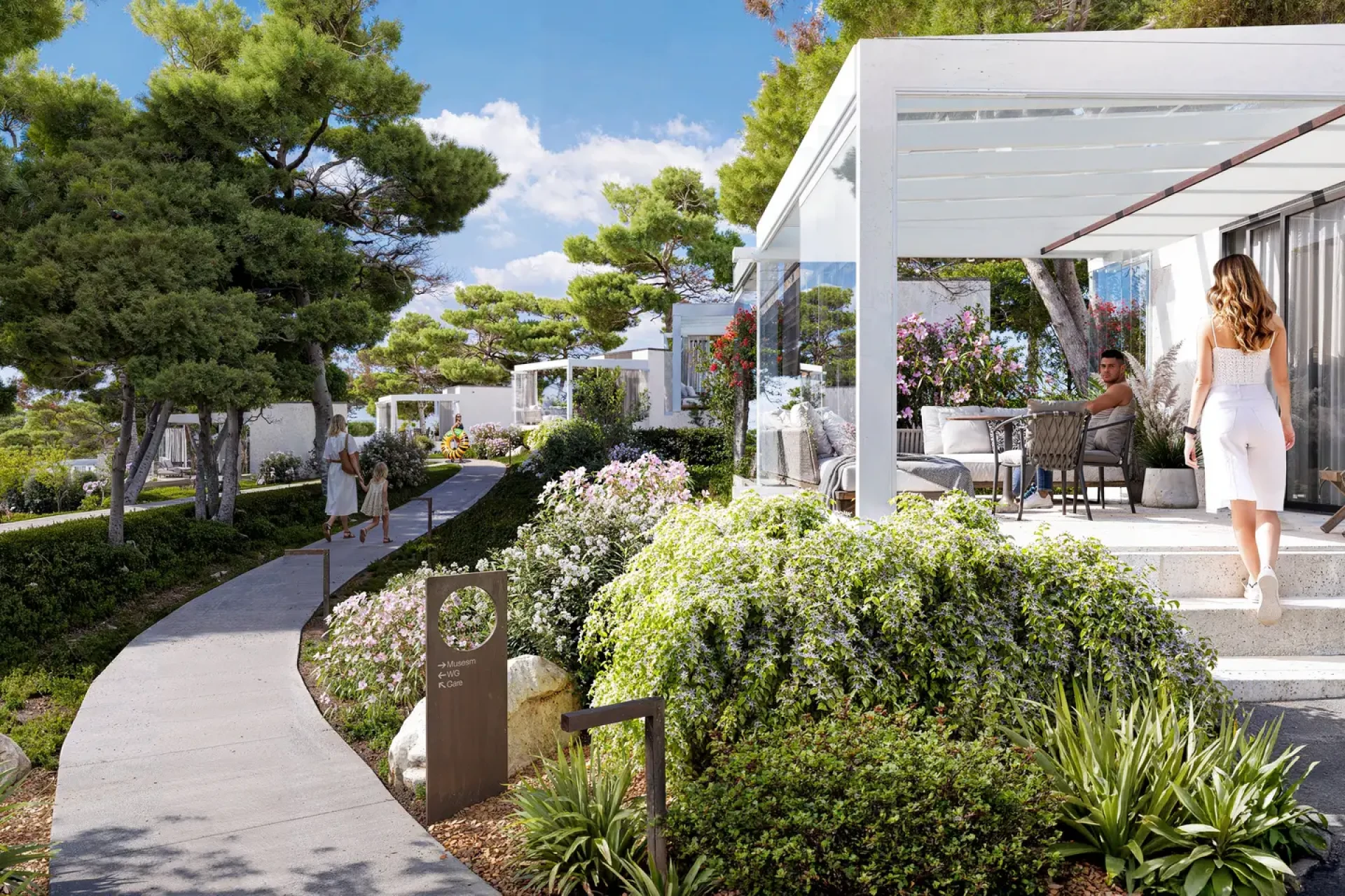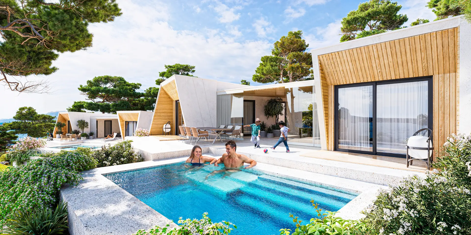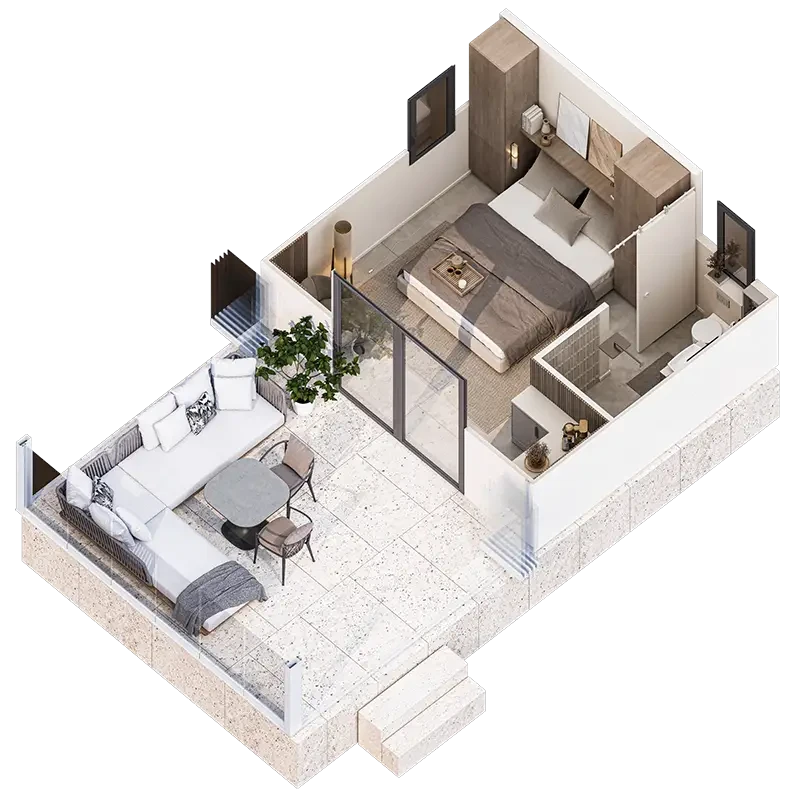 Budynki 1-4: 52 apartamenty o powierzchni 34 m², w tym 13 z prywatnymi ogródkami i 13 z bezpośrednim dostępem do prywatnych basenów.