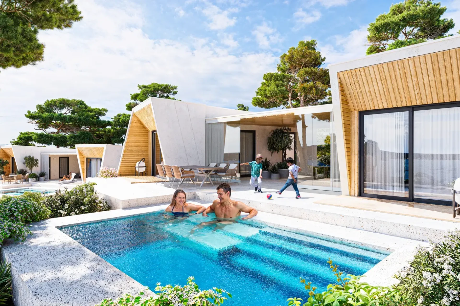 Budynki 1-4: 52 apartamenty o powierzchni 34 m², w tym 13 z prywatnymi ogródkami i 13 z bezpośrednim dostępem do prywatnych basenów.